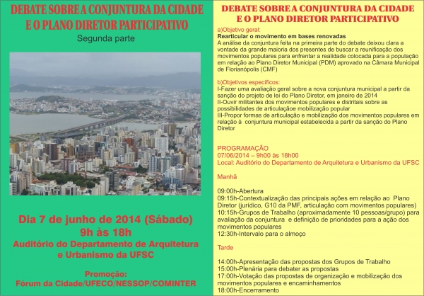 O FÓRUM DA CIDADE, juntamente com a UFECO, O NESSOP e o COMINTER, com base nesta realidade municipal, está promovendo a realização da SEGUNDA PARTE DO DEBATE POPULAR E UNIVERSITÁRIO - “A CONJUNTURA DA CIDADE E O PDP” a se realizar neste SÁBADO, DIA 07/06, no Departamento de Arquitetura e Urbanismo da UFSC, com o objetivo de proporcionar o aprofundamento da avaliação de conjuntura ocorrida na PRIMEIRA PARTE do debate, com 64 pessoas de diversas entidades da sociedade organizada, e discutir a retomada da articulação e das ações dos movimentos populares, sociais e sindicais da cidade. Entendemos que vamos precisar estar organizados para enfrentar as reuniões e Audiências Públicas novamente programadas às pressas, que são de fato simulacros de participação, promovidas pela PMF.